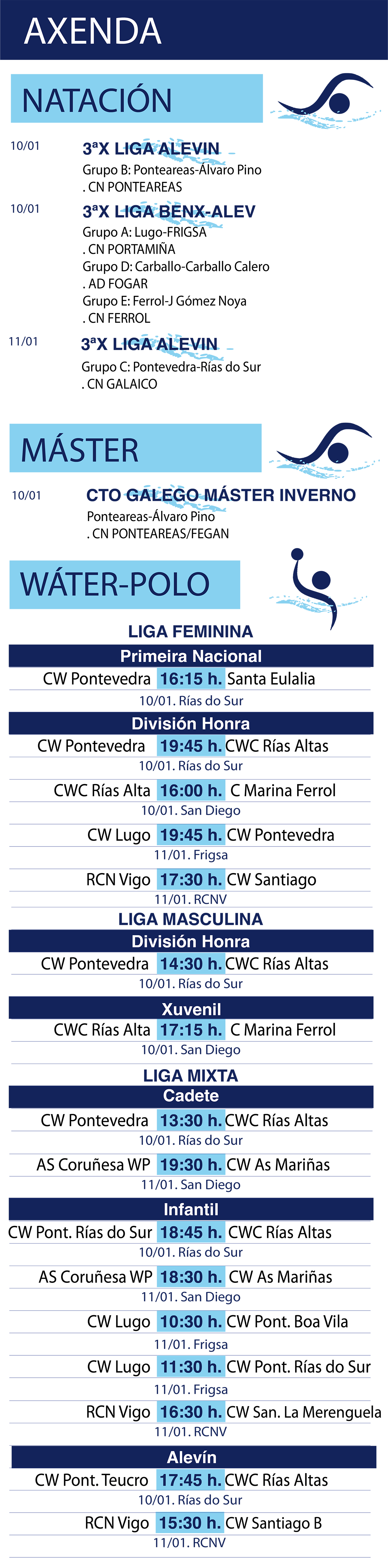 O 10 de xaneiro, 1ª xornada de Tecnificación do Programa de Seguimiento das categorías Benxamín e Infantil de Natación. Será na piscina de Redondela.