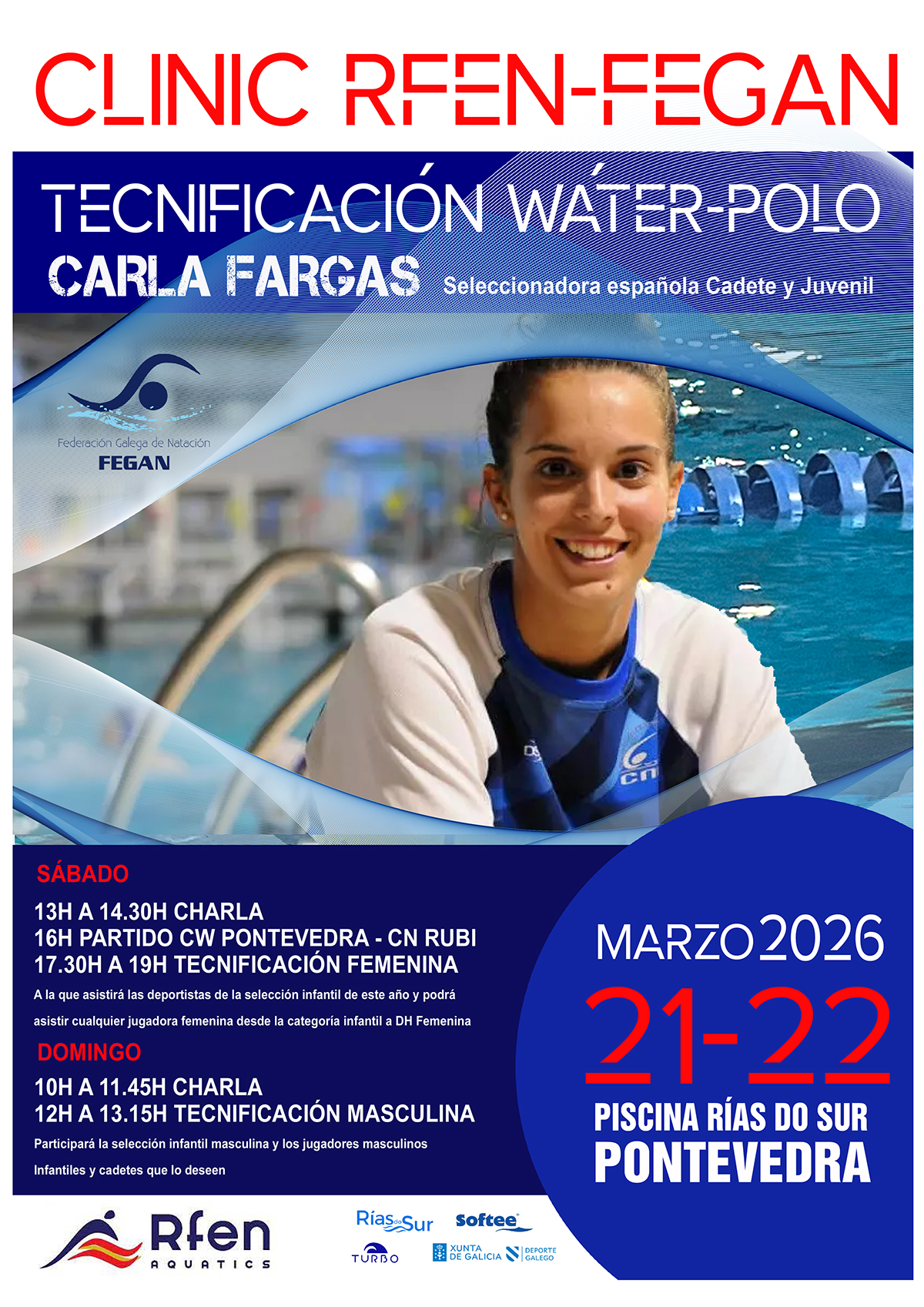 Web do CampionatoOs días 21 e 22 de marzo a Federación Galega de Natación organiza en colaboración coa Real Federación Española de Natación, un Clinic de Tecnificación de Wáter-polo con Carla Fargas, seleccionadora española Cadete e Xuvenil .